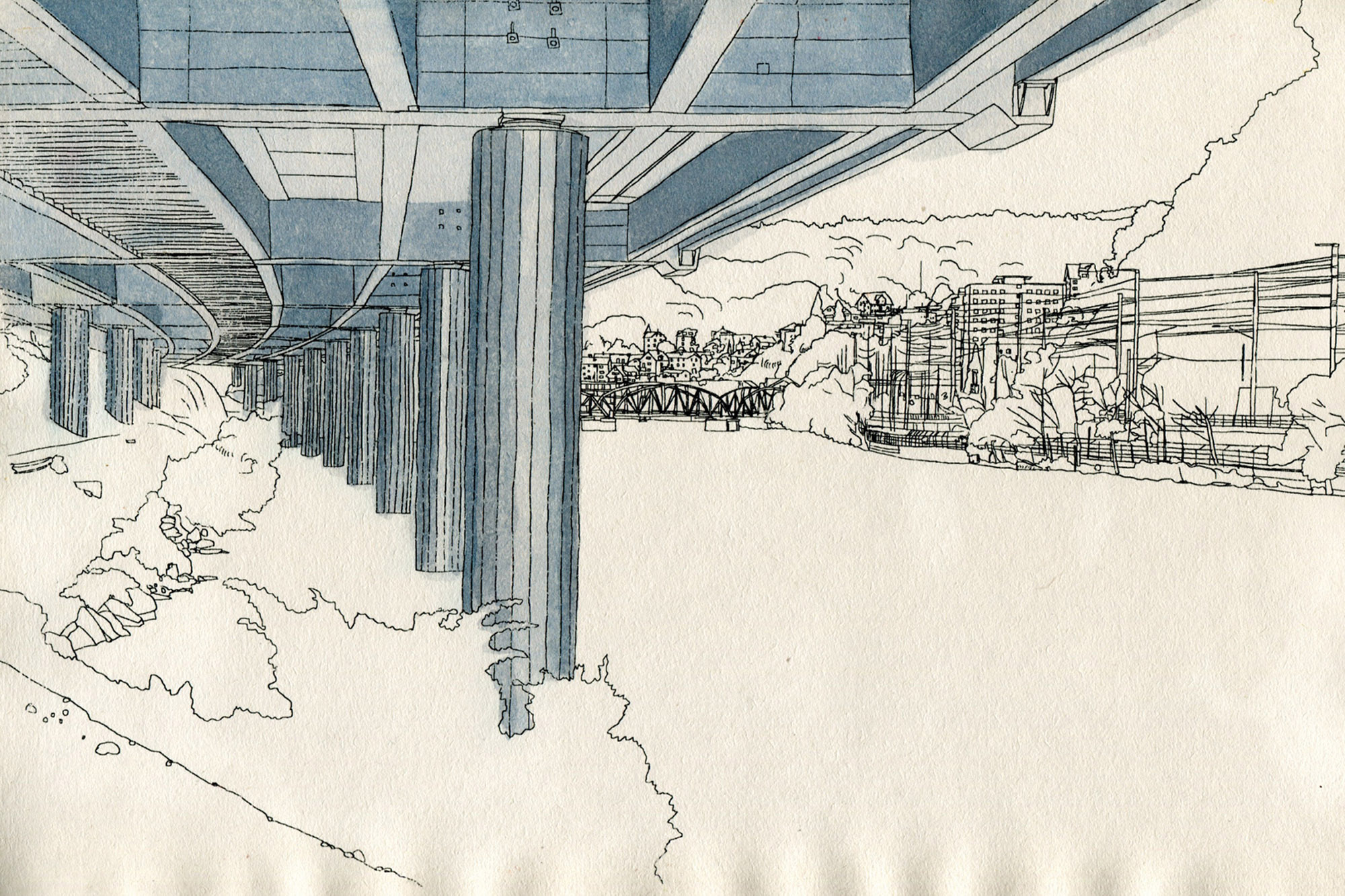 Meine Mitstudentin Laura zeigt mir und ein paar Freunden ihren Lieblingsort unter der Autobahnbrückein Luzern. Während Autos und Lastwagen über unseren Köpfen hinweg donnern, hören wir Laura zu, wie sie die Landschaft mit Worten zeichnet