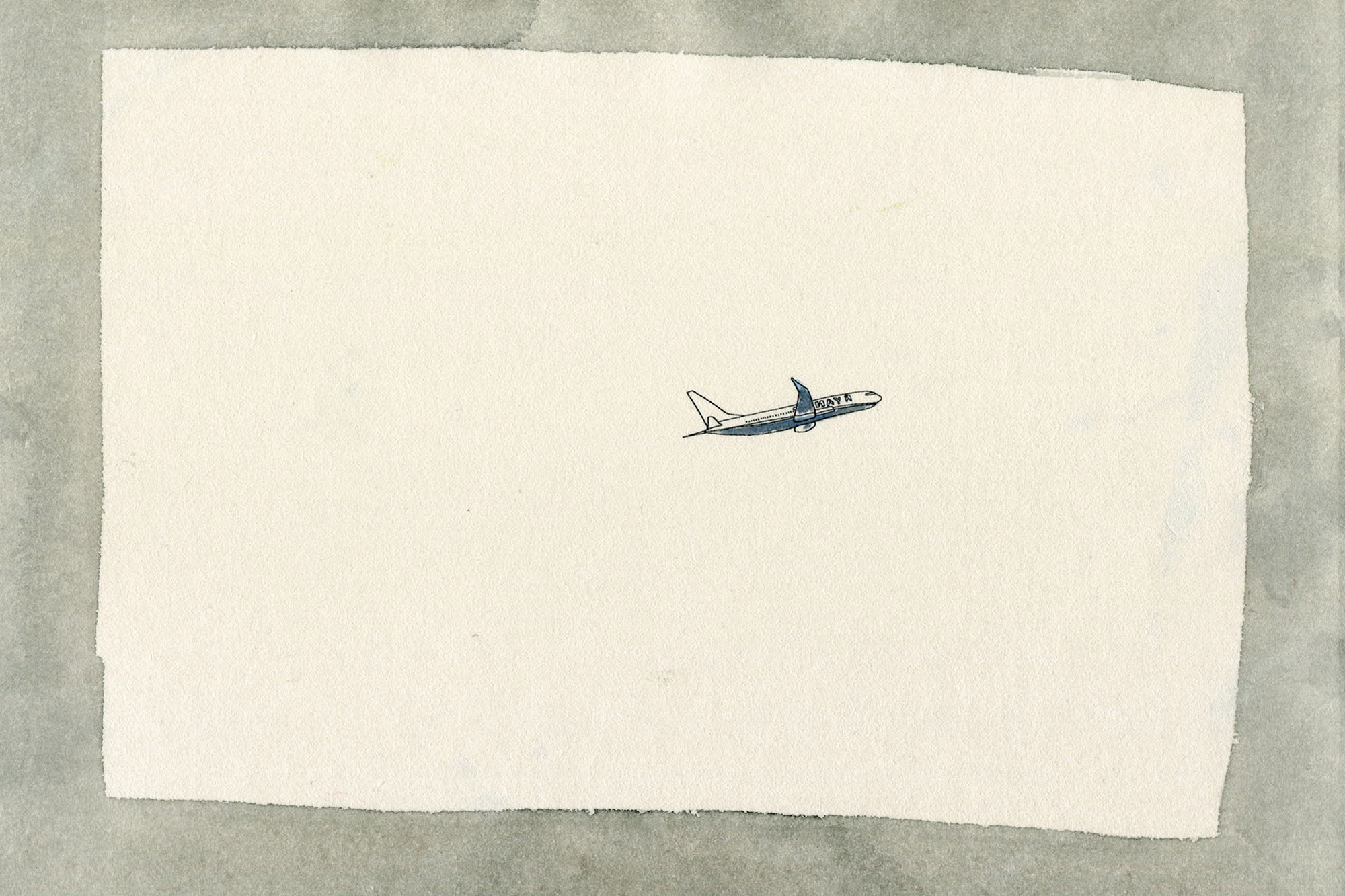 Mein Atelier in Allschwil befindet sich in der Anflugschneise vom Flughafen Mulhouse. Wann immer ich aus dem Fenster schaue, fliegt gerade ein Flugzeug vorbei – als wäre mein Fenster eigentlich ein Bild, «Himmel mit Flugzeug».