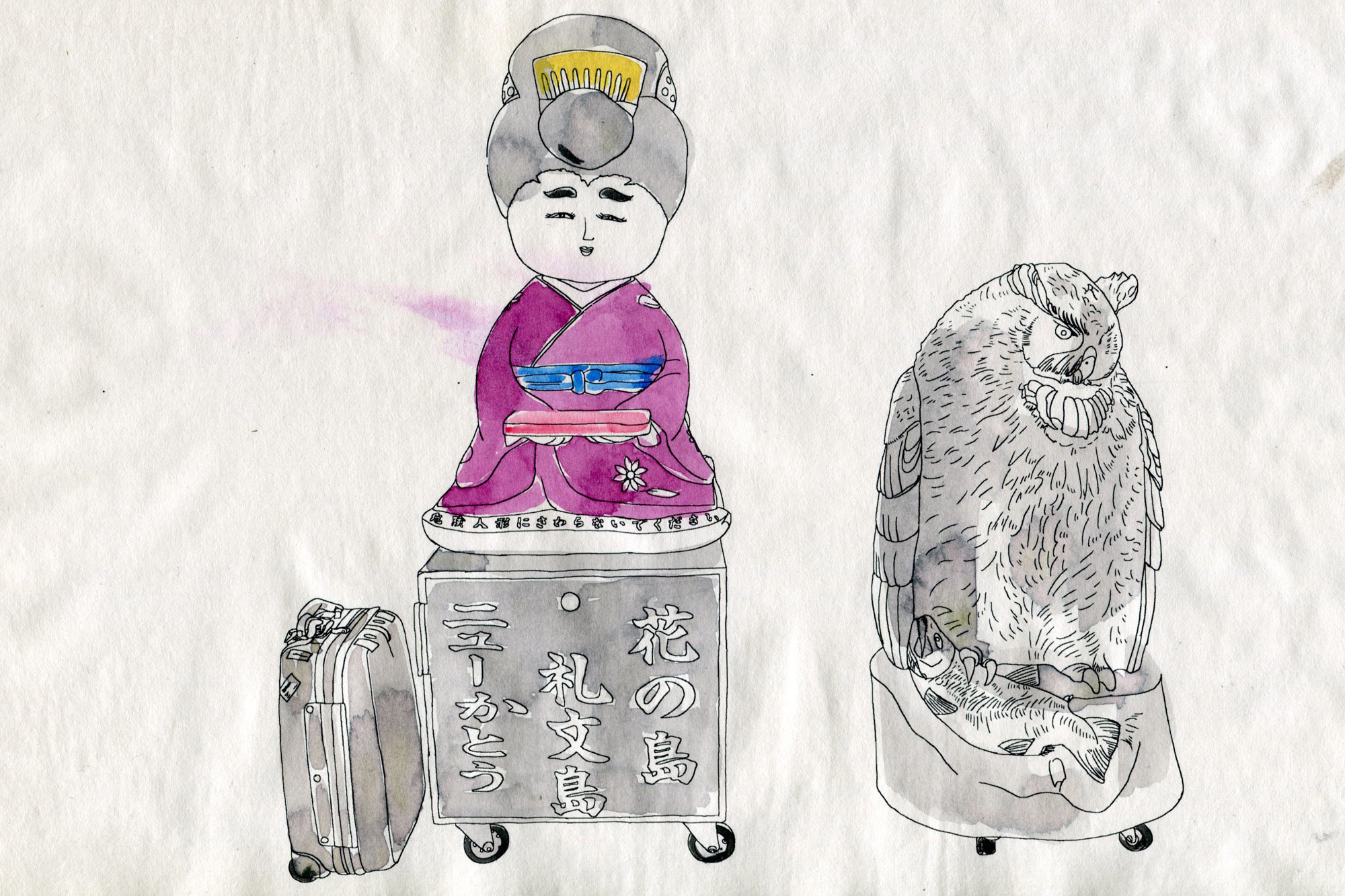 Nach einer vierstündigen Fahrt mit der Fähre von Wakkanai kommen wir auf der Insel Rebun an. Bei der Anlagestelle verkaufen Souvenirläden Kunsthandwerk von den Ureinwohnern, den Ainus. Ich fühle mich ein wenig wie in Zermatt.