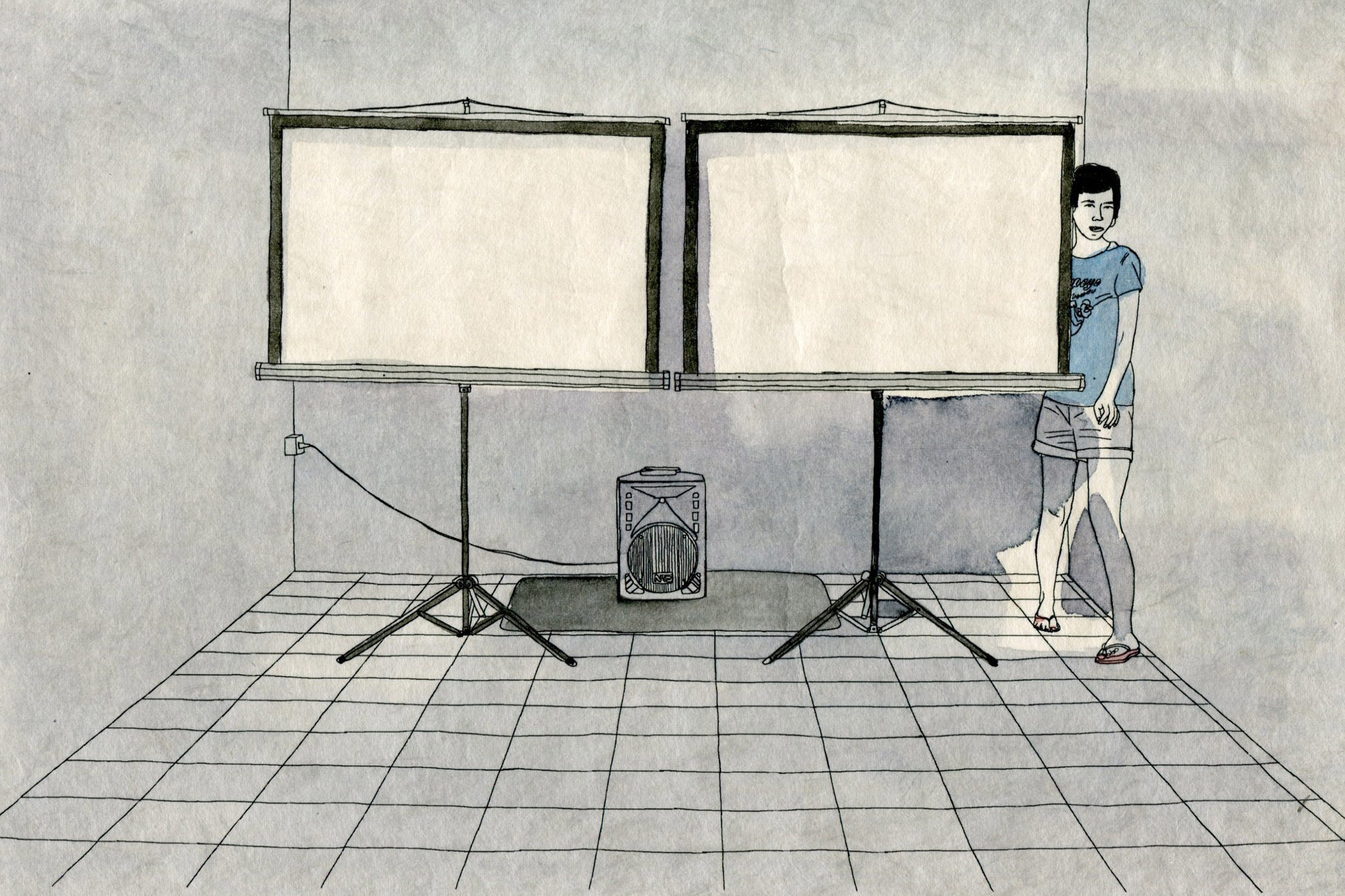 Im zweiten Stock eines ehemaligen Geschäftshauses in der Innenstadt von Bangkok zeigen wir eine Zweikanalvideoinstallation, welche etwas heikel zu bedienen – und gar nicht zu verkaufen ist. Som, die Galeristin, betreibt eine Bar im Parterre und ist so nicht auf Verkäufe angewiesen.