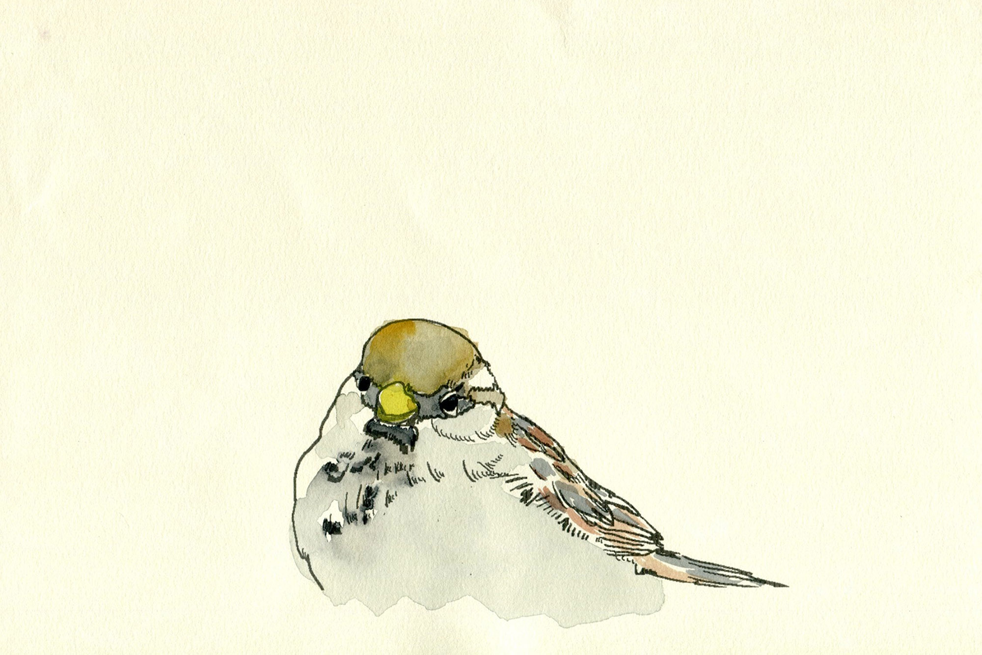 Während meinem Aufenthalt in Paris erreicht mich die Nachricht, dass ich noch in diesem Jahr die erste Illustration für die nächste Kolumne der «Neuen Zürcher Zeitung» liefern muss. Am Weihnachtstag suche ich Spatzen, aber ich finde ganz lange nur Tauben, dann endlich in einem Gebüsch an der Rue de Bretagne…