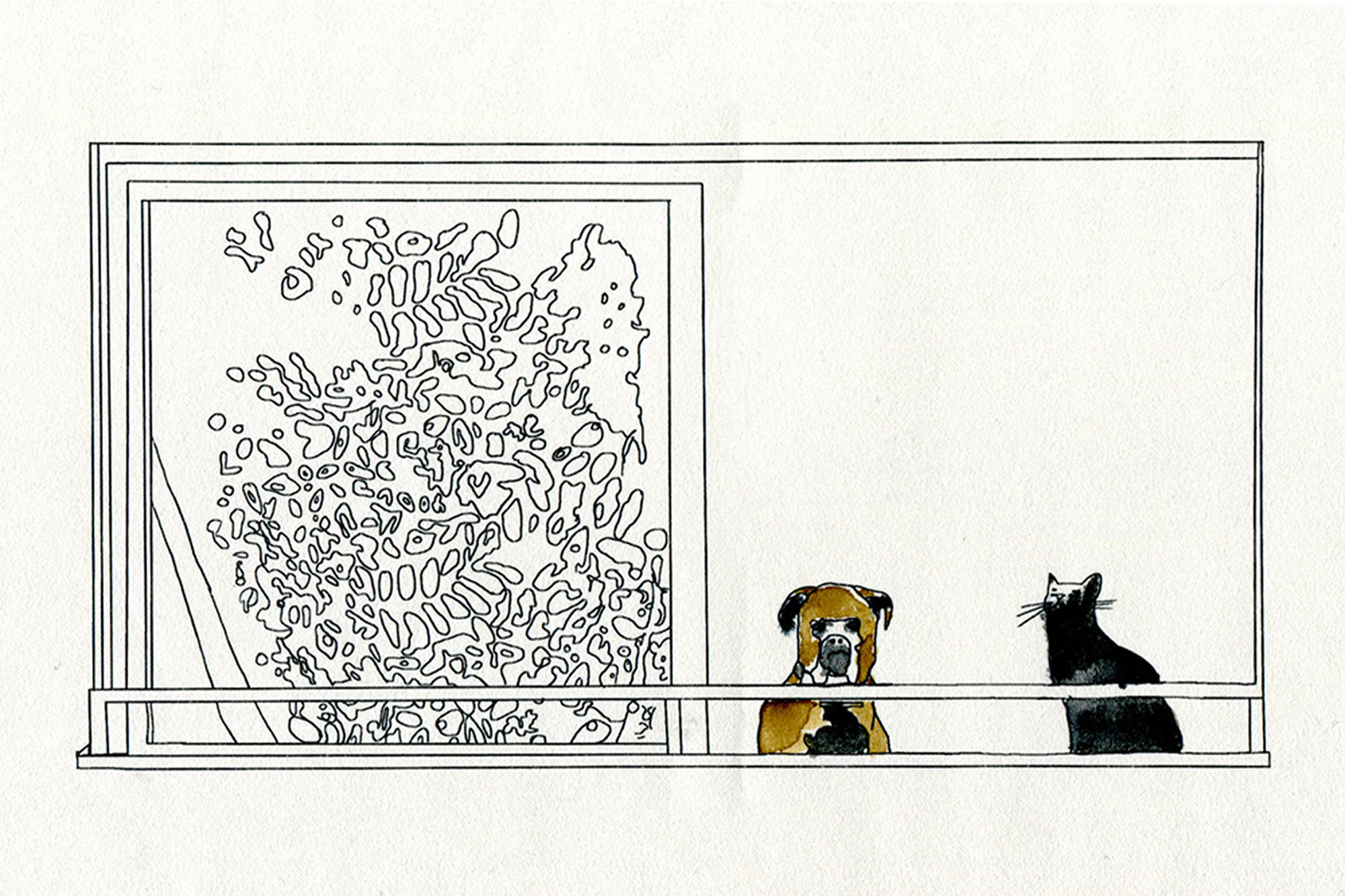 In der Amerbachstrasse 62 in Basel wohnen zwei ungleiche Freunde und überwachen die Nachbarschaft. Ich frage mich, was sie verbindet, warum sie nicht wie «Tom & Jerry» durch die Wohnung jagen. Vielleicht warten sie auf ihr gemeinsames Herrchen. Vielleicht sind sie alt und müde. Vielleicht haben sie nichts mehr zu streiten. Oder sind sie am Ende ausgestopft?